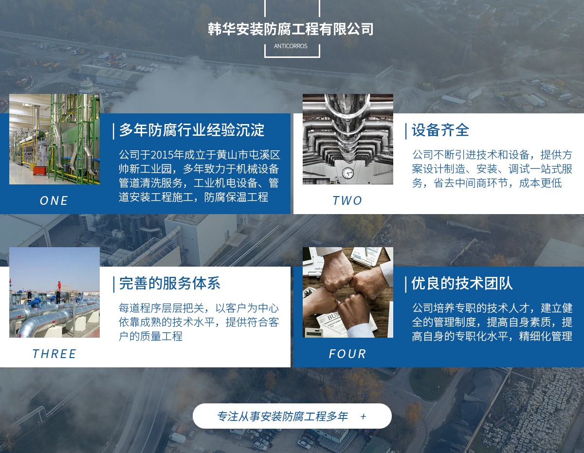 黃山市韓華建設工程有限公司坐落于美麗的黃山市屯溪區老街街道新安北路夢園村,公司主營機械設備管道清洗服務,工業機電設備、管道安裝工程施工,防腐保溫工程;防水防火工程等...